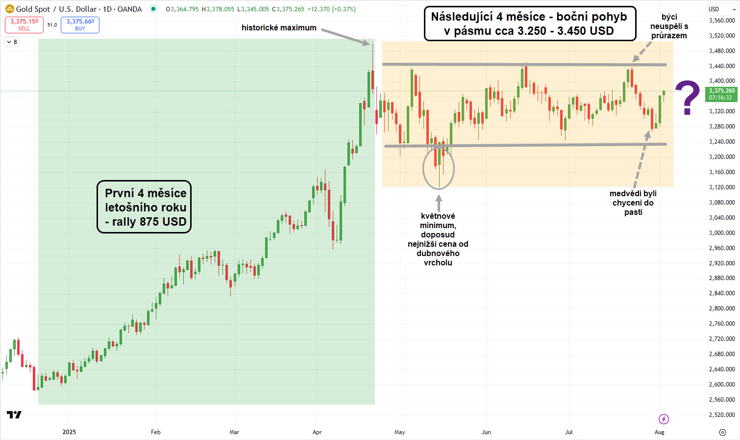 Relativně dlouhé čtyřměsíční období bočního pohybu trhu zlata pokračuje a dá se říci, že zlato vysílá falešné signály na horní i dolní straně tohoto rozpětí. Nejprve se zlatu 22. července nepodařilo úspěšně prolomit cenu 3.450 USD, kdy býci dle COT reportu dychtivě naskočili do LONG pozic s vyhlídkou na jasné prolomení poslední rezistence. Následně ani silný medvědí signál (viz článek Tři černé vrány dosedly na zlato) nepřinesl medvědům kýžené výsledky, neboť spotová cena sice klesla pod důležitou podporu 3.300 – 3.280 USD, avšak hbitě se vytočila zpět a zakončila týden v zisku.