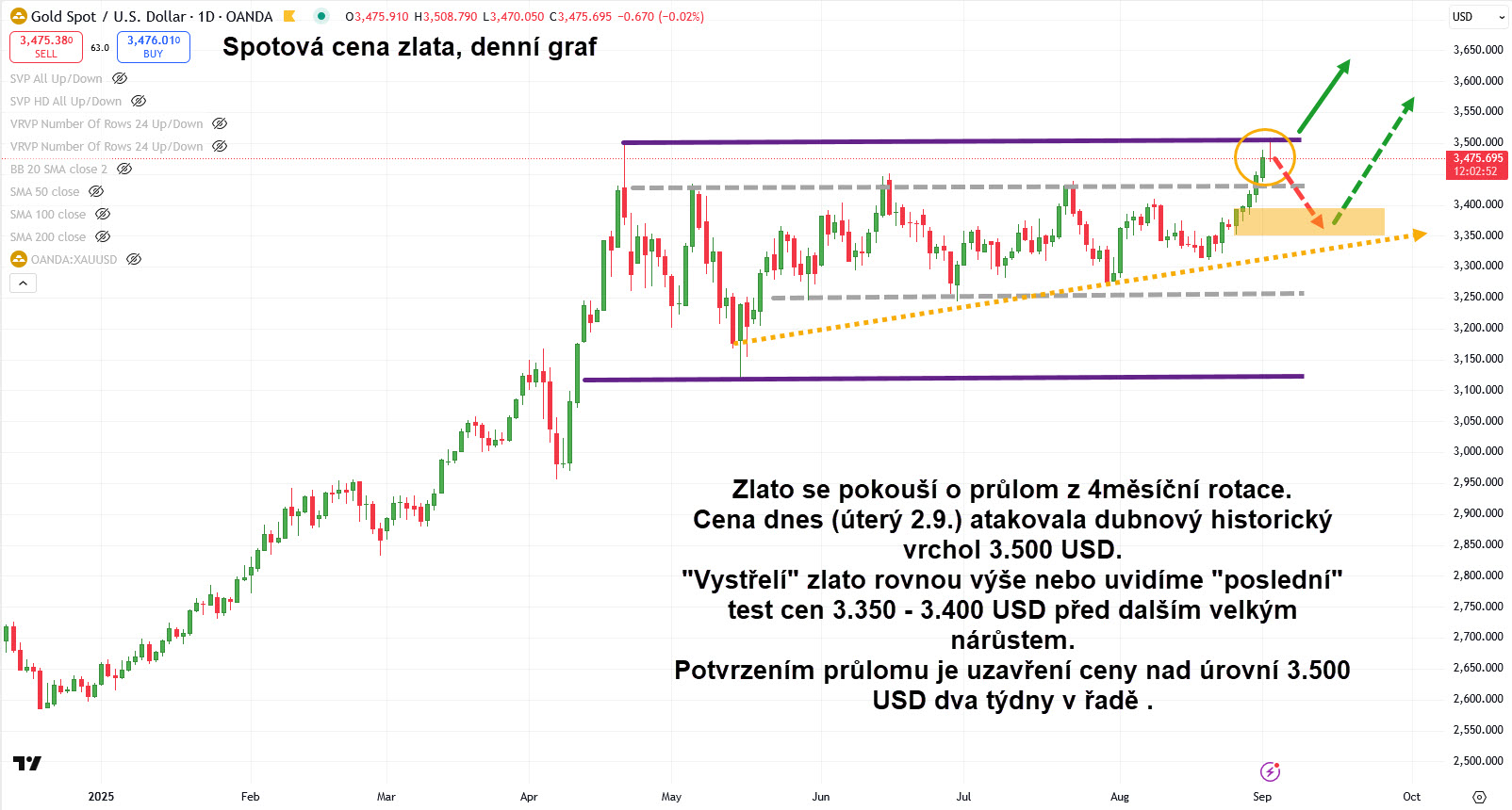 Zlato se pokouší prolomit svou 4měsíční rotaci. Dnes (úterý 2. září) během asijské noční seance cena zaútočila na historické maximum z dubna ve výši 3.500 USD a mírně jej překonala. V našem podcastu jsme uvedli, že boční pohyb zlata bude prolomen v jednom nebo druhém směru nejpozději v druhé polovině září.